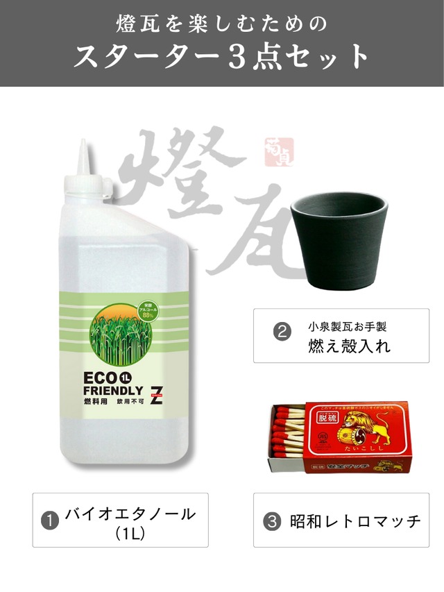 卓上焚き火台燈瓦( https://ecraftsman.base.shop/items/118000857 ) をすぐに楽しめる3点セット。燈瓦をはじめての方におすすめです。 ◆セット内容 バイオエタノール(1L)× 1 瓦の燃えがら入れ(径70㎜×高さ45㎜/重量80g)× 1 ※小泉製瓦製 昭和レトロマッチ(38本入り)× 1 送料込み ◆ご注意 瓦の燃えがら入れはご注文後に窯入れするため、他の商品より発送が遅れます。マッチとエタノールは発送元が異なるため、別々に届く場合があります。 ▼関連する燈瓦アイテムはこちら ✔️ 燈瓦 本体( https://ecraftsman.base.shop/items/118000857 ) ✔️ バイオエタノール(1L)( https://ecraftsman.base.shop/items/138289226 ) ✔️ 昭和レトロマッチ 3個セット( https://ecraftsman.base.shop/items/138289410 )